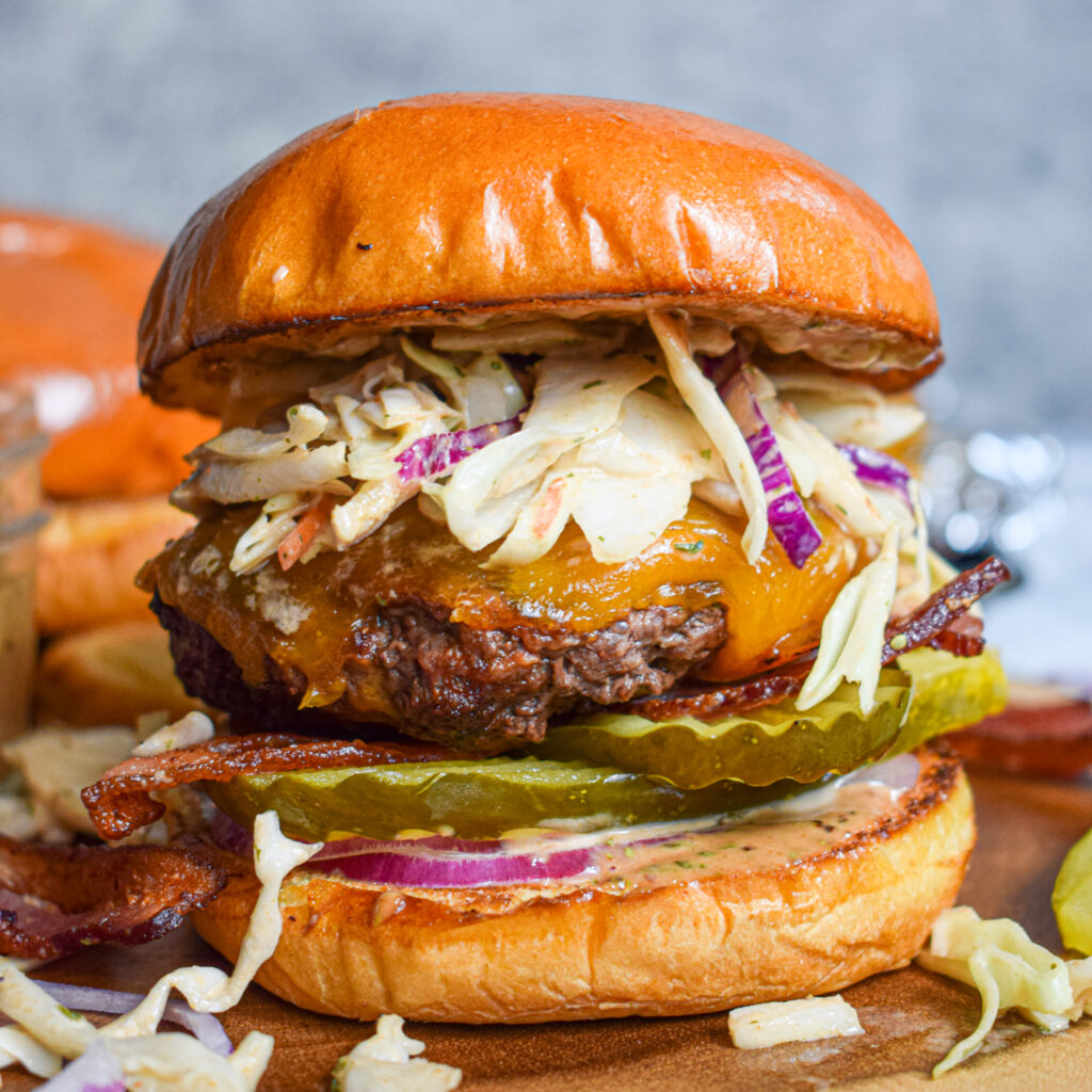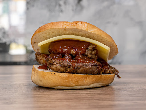 BBQ sauce, house mayo, chives, slaw, gherkins